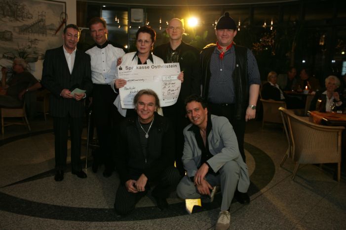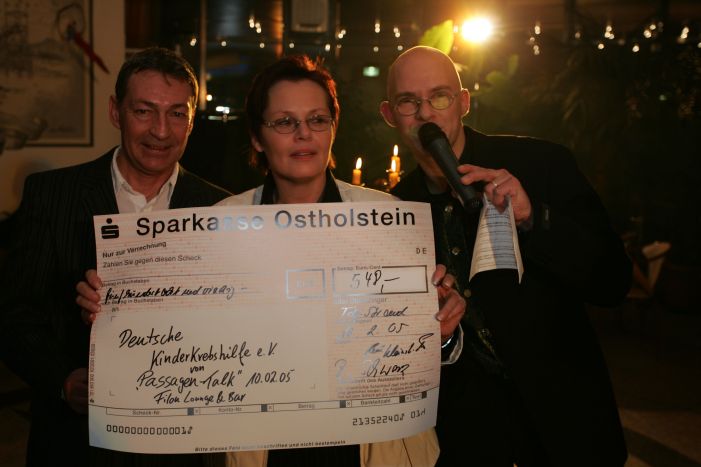 Scheckübergabe: NDR-Moderator Jean André, Assistentin Rotraud Schwarz und Talkshow-Macher René Kleinschmidt bedanken sich bei den Gästen für die Gesamtspende von 548,- Euro!