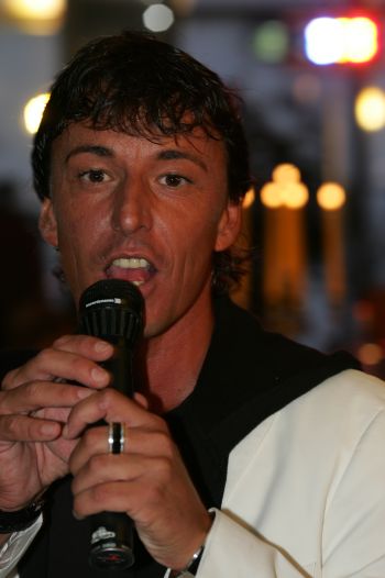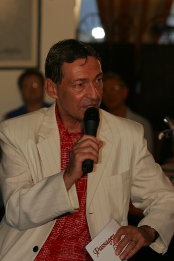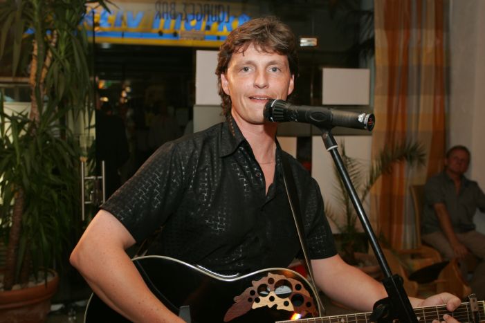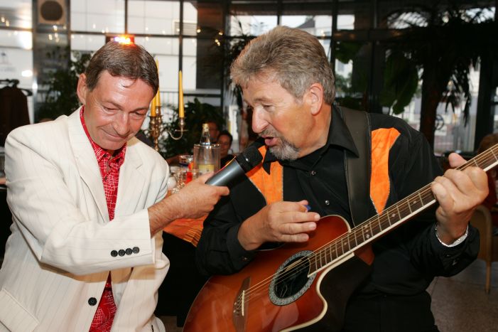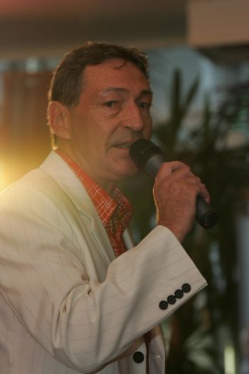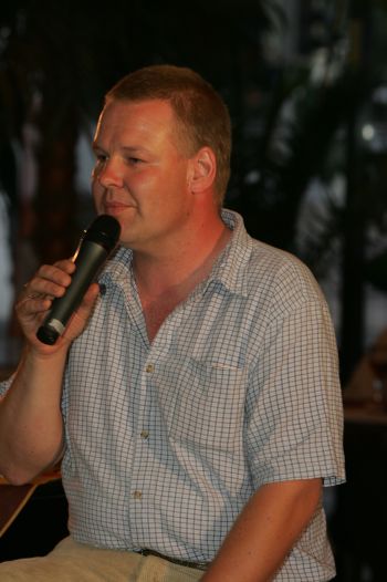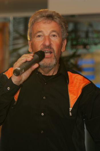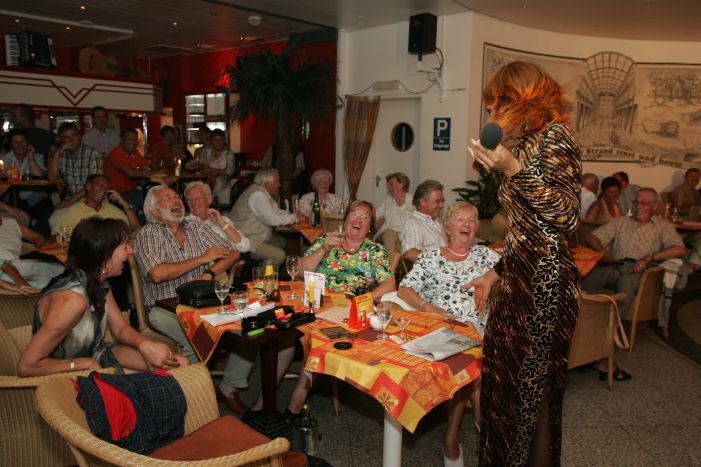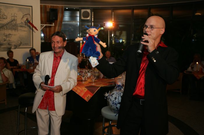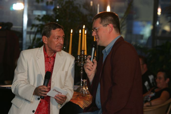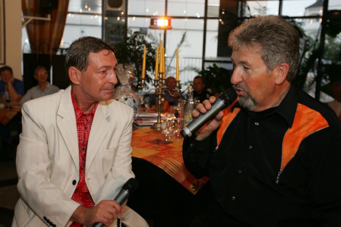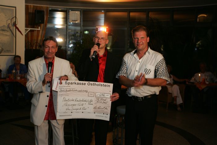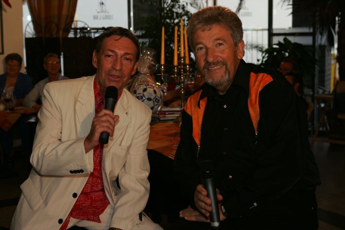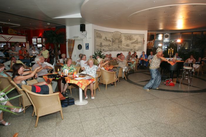NDR-Moderator Jean André begrüßt die Gäste in der ausverkauften Bar und kündigt Entertainer Hardi Hartmann an