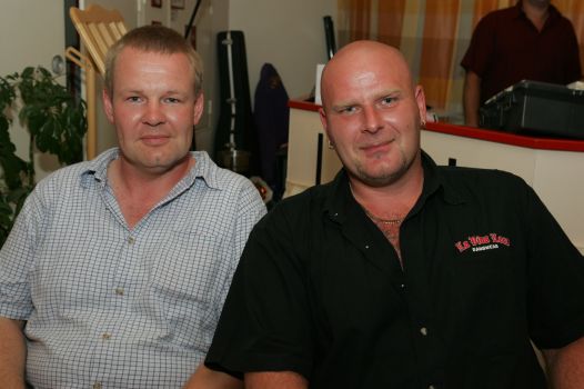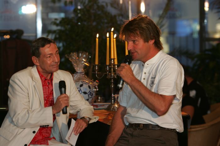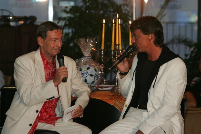 Moderator Jean André und Talkshow-Organisator René Kleinschmidt während der Versteigerung des HSV-Fußballs