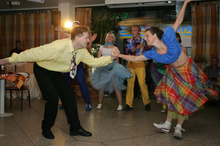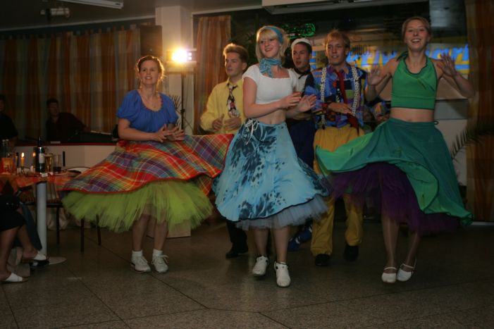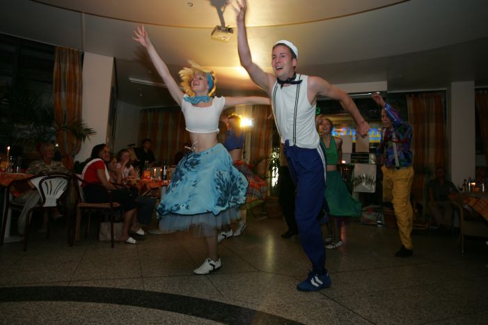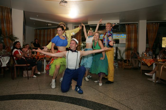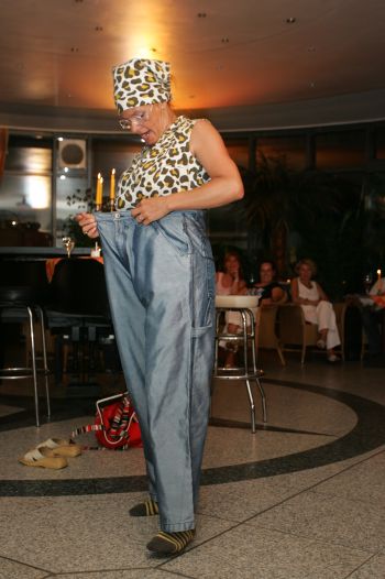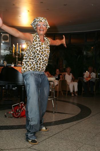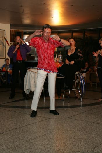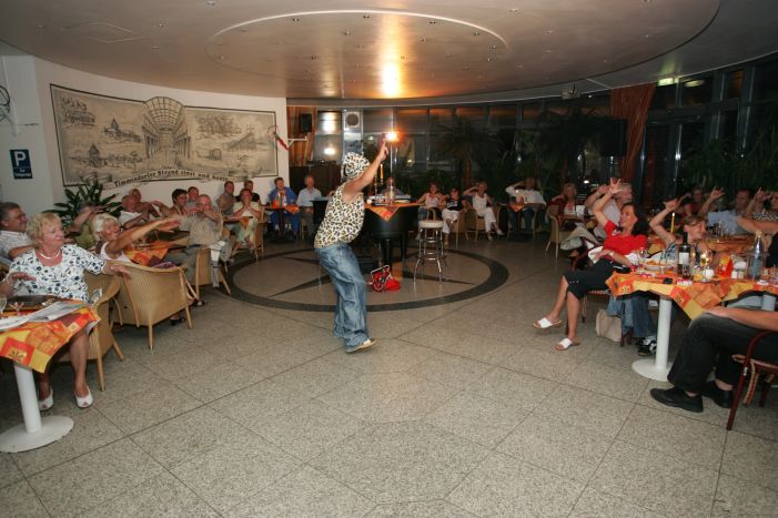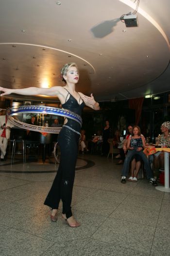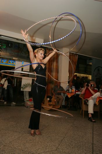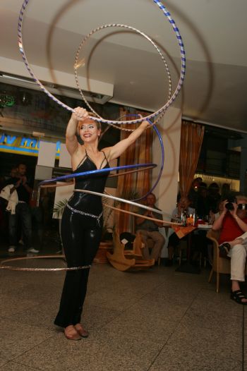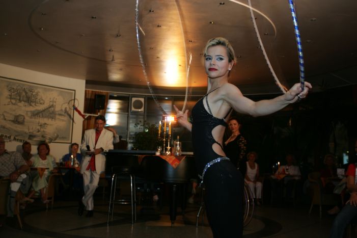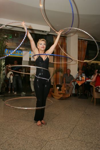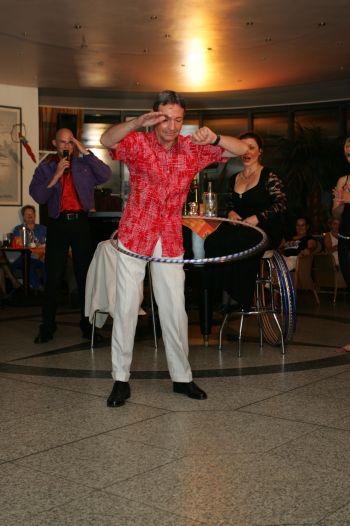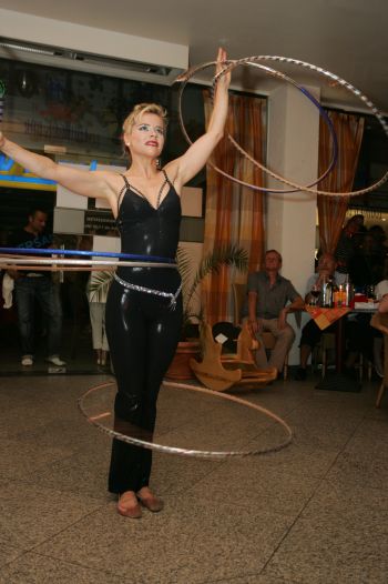 Dann überraschte René Kleinschmidt seinen Moderator mit der Hula-Hoop-Künstlerin Caroline Hammer und der Bitte, es auch einmal auszuprobieren - gesagt, getan - zum Vergnügen der Zuschauer in der