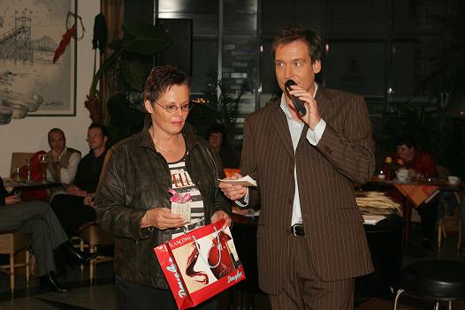 Assistentin Rotraud Schwarz mit Thorsten Kremer während der Verlosung