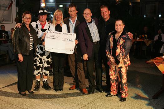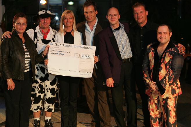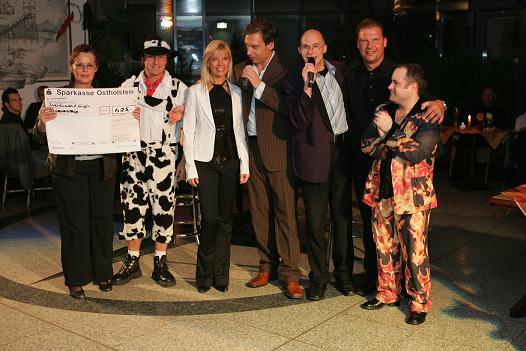 Scheckübergabe: Der Moderator, das Organisationsteam und die Künstler bedanken sich bei den Gästen im Namen der Deutschen KinderKrebshilfe für die Spenden